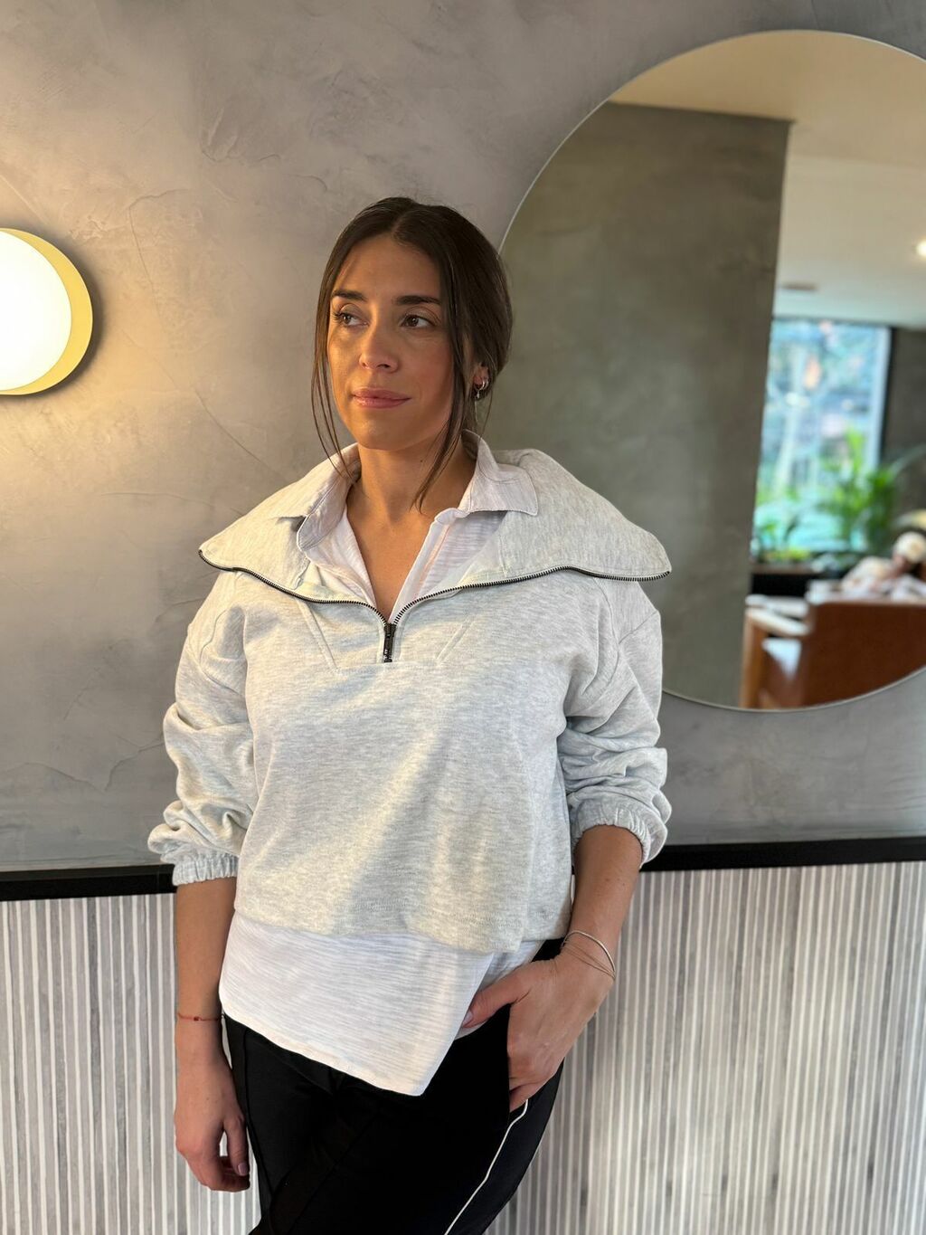 Buzo ancho, presenta canesú y cierre en el maxi cuello. Mangas con terminación de elástico en el puño. Corte a la primer cadera (ideal para tiro alto).