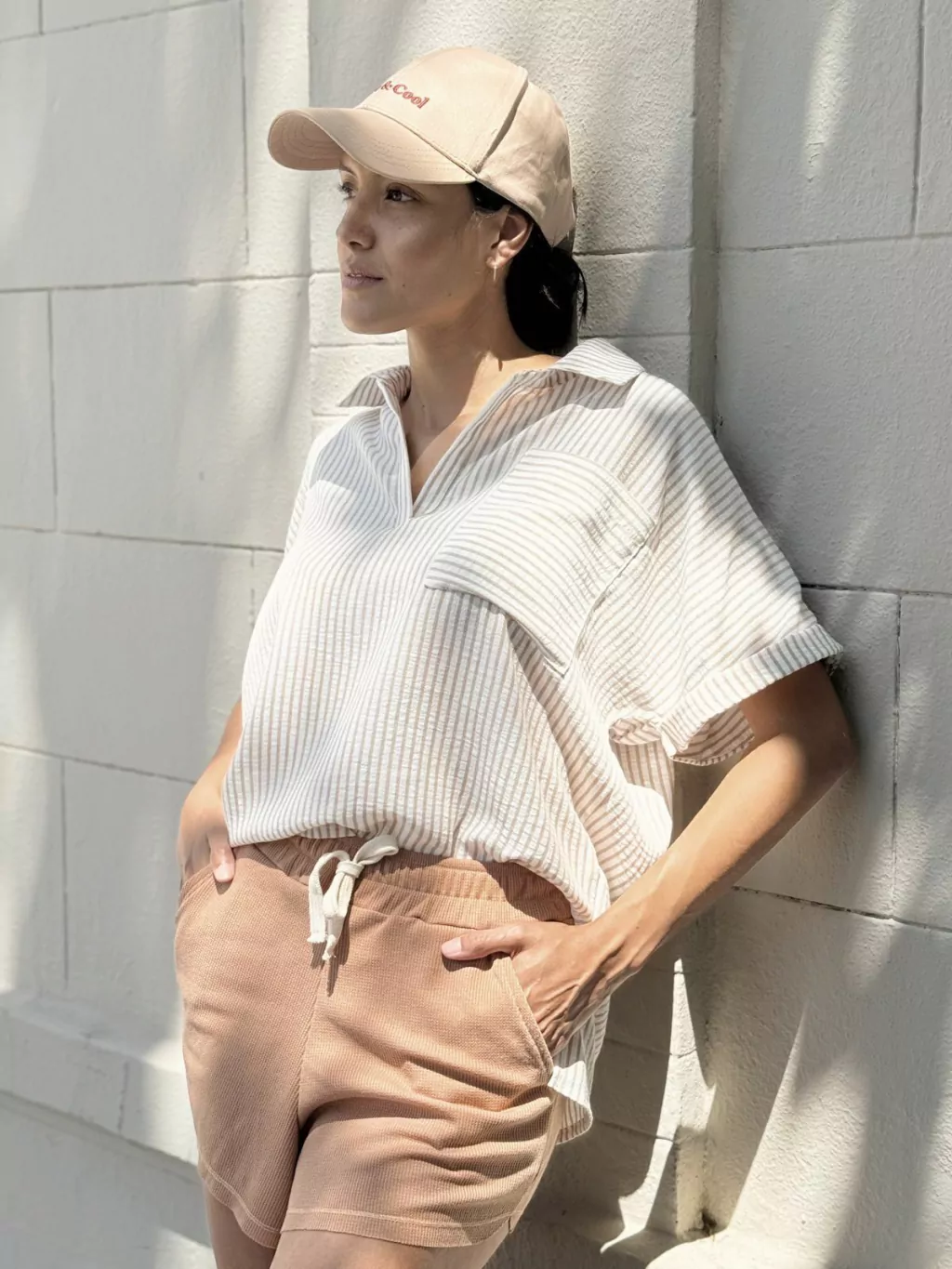 Chomba con escote abierto, mangas murciélago. Corte oversize. Presenta maxi bolsillo en lateral izquierdo a contraraya.Tajos laterales. Material poplin 100 % algodon.